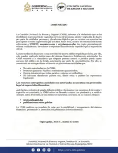 Mediante un comunicado, la CNBS informó que ha identificado al menos tres plataformas que estarían operando sin regulación: UNIFIN, monavex y cryptaespon, las cuales promocionan supuestos servicios de inversión, ahorro y captación de dinero, ofreciendo rendimientos atractivos sin respaldo legal ni supervisión oficial.