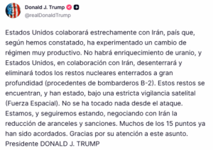 El expresidente de Estados Unidos, Donald Trump, publicó un mensaje en su red social Truth Social en el que afirmó que su país colaborará estrechamente con Irán en temas relacionados con energía y control nuclear.