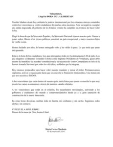 Ante el vacío de poder generado por el traslado de Maduro fuera del país, Machado aseguró que las fuerzas democráticas están organizadas para garantizar el orden y la libertad. La líder opositora afirmó que Venezuela ha cerrado un capítulo oscuro y que están listos para asumir el mandato del pueblo para comenzar la reconstrucción inmediata de la nación, haciendo un firme llamado a la calma y a la unidad nacional.