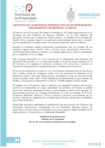 El Instituto de la Propiedad (IP) realizó la entrega de 372 títulos de propiedad en el municipio de San Francisco de Becerra, Olancho, con la visita especial del Secretario Privado de la presidenta, Héctor Zelaya y la ministra de la presidencia, Sarahí Cerna, quienes llegaron a supervisar personalmente la jornada y celebrar con los beneficiarios la buena noticia de obtener la legalidad sobre sus tierras.