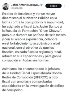Un mensaje publicado en la red social X por el fiscal general, Johel Antonio Zelaya, confirmó la salida del fiscal Luis Javier Santos de la jefatura de la Unidad Fiscal Especializada Contra Redes de Corrupción (UFERCO), una decisión que ha generado sorpresa, críticas y fuertes cuestionamientos en distintos sectores del país.