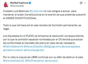 La diputada Maribel Espinoza lanzó una advertencia directa al presidente del Congreso Nacional, Luis Redondo, a quien acusó de actuar de manera ilegal y de poner en riesgo el orden constitucional del país. A través de un mensaje publicado en la red social X, la parlamentaria señaló que no permitirán acciones que, a su criterio, busquen subvertir la legalidad desde el Poder Legislativo.