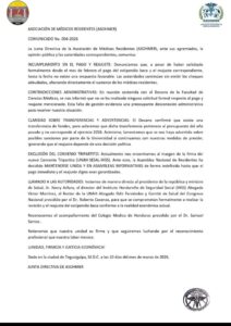 En el comunicado, los médicos residentes indicaron que actualmente se encuentran al margen de la firma del nuevo convenio tripartito entre la Universidad Nacional Autónoma de Honduras, la Secretaría de Salud de Honduras y el Instituto Hondureño de Seguridad Social.