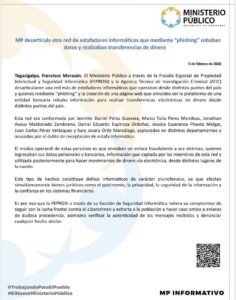 El Ministerio Público a través de la Fiscalía Especial de Propiedad Intelectual y Seguridad Informática (FEPROSI) y la Agencia Técnica de Investigación Criminal (ATIC) desarticularon una red más de estafadores informáticos que operaban desde distintos puntos del país y quienes mediante “phishing” y la creación de una página web que simulaba ser la plataforma de una entidad bancaria robaba información para realizar transferencias electrónicas de dinero desde distintos puntos del país.