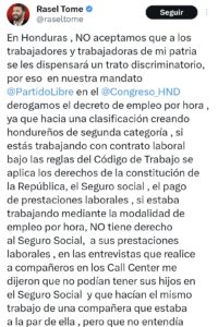 El dirigente del Partido Libertad y Refundación (Libre), Rasel Tomé, aseguró que en Honduras no se puede ni se debe permitir un trato discriminatorio hacia la clase trabajadora, al recordar que durante el actual mandato de Libre en el Congreso Nacional se derogó el decreto de empleo por hora por considerarlo una figura que creaba “hondureños de segunda categoría”.