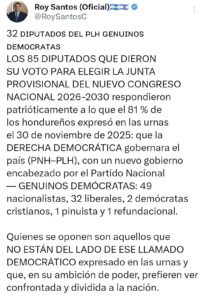 A través de un mensaje publicado en la red social X, Santos sostuvo que los 85 diputados que votaron a favor de la junta provisional actuaron de manera patriótica, alineándose —según afirmó— con el 81 % de los hondureños que, a su criterio, respaldaron un giro político para que la denominada derecha democrática asumiera la conducción del país.